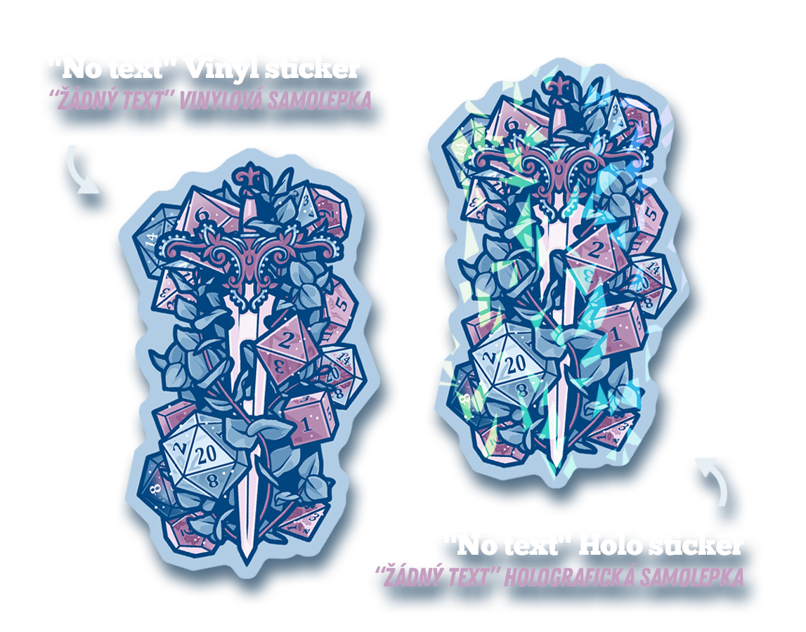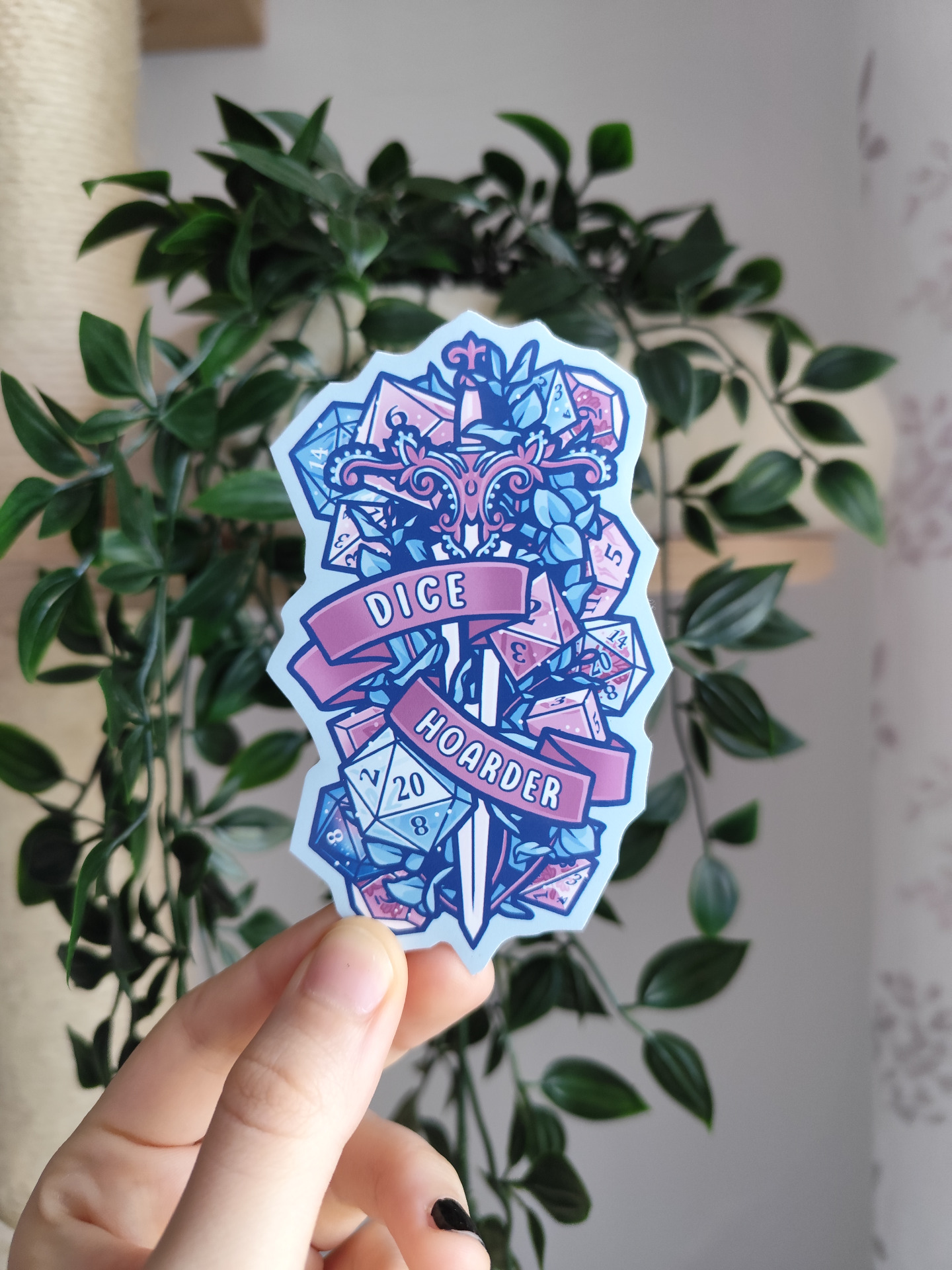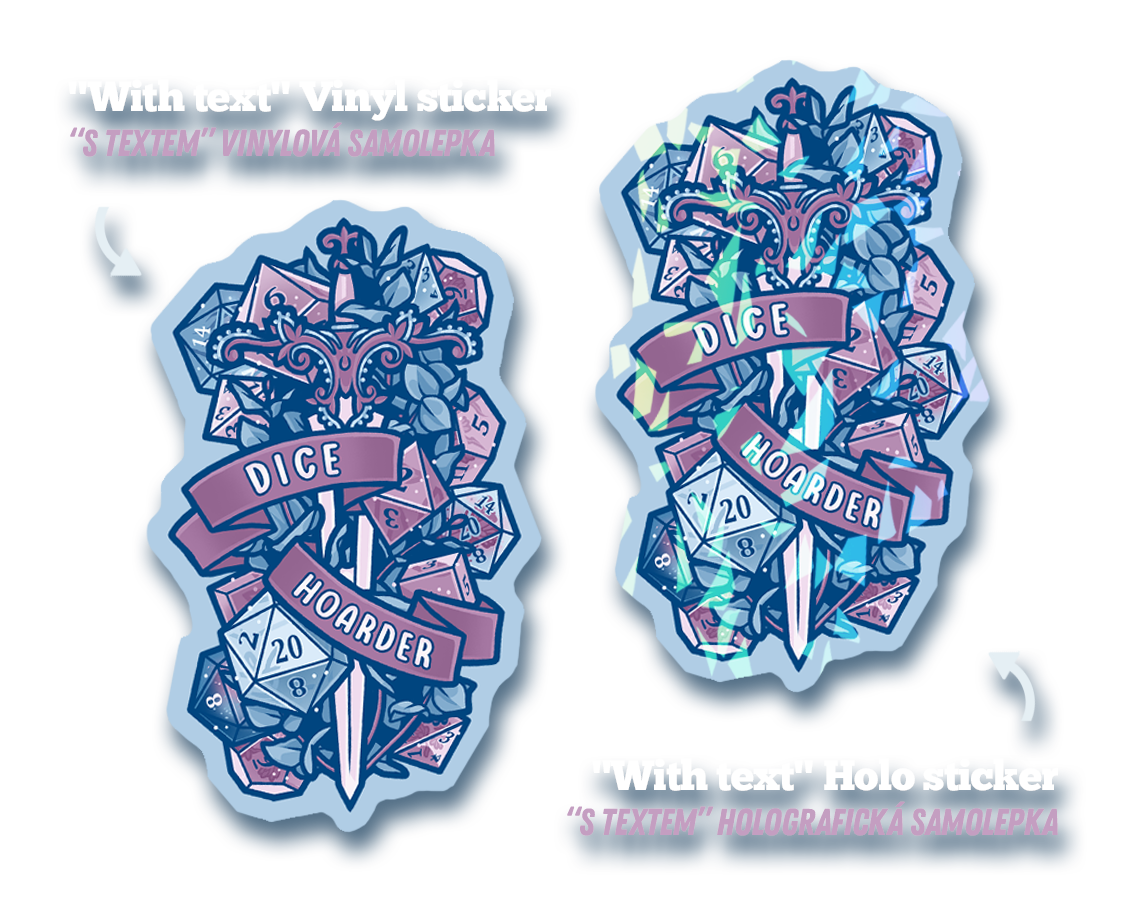 Pick "With text" variation to include the "Dice hoarder" writing over the design as shown, or "No text" variation for sword with dice only.