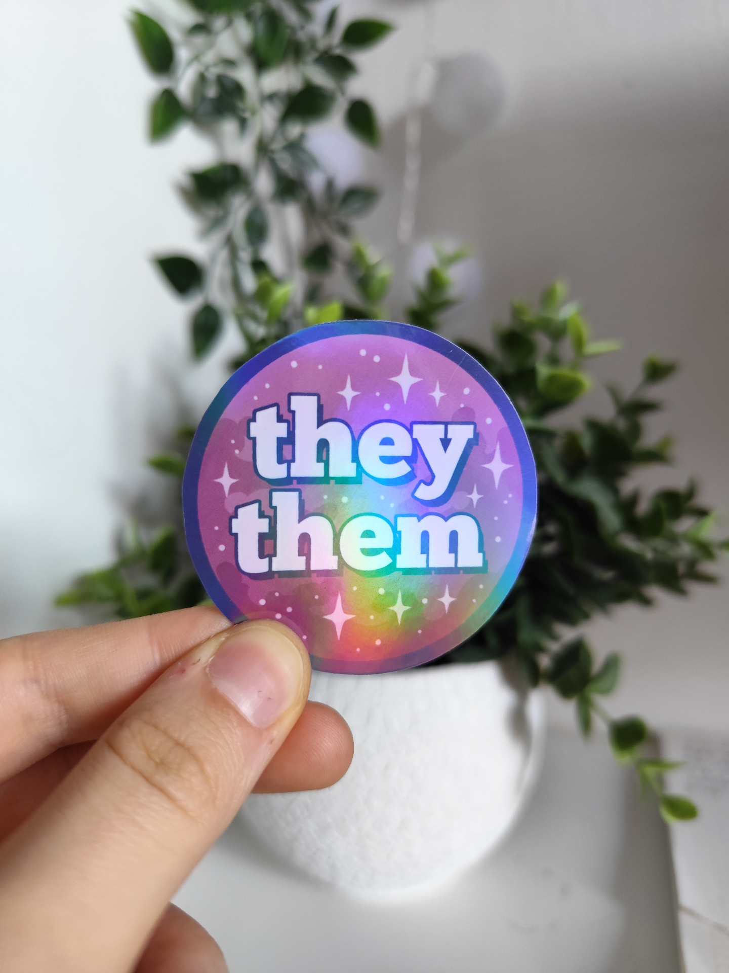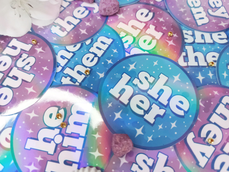 Holographic stickers with pronouns