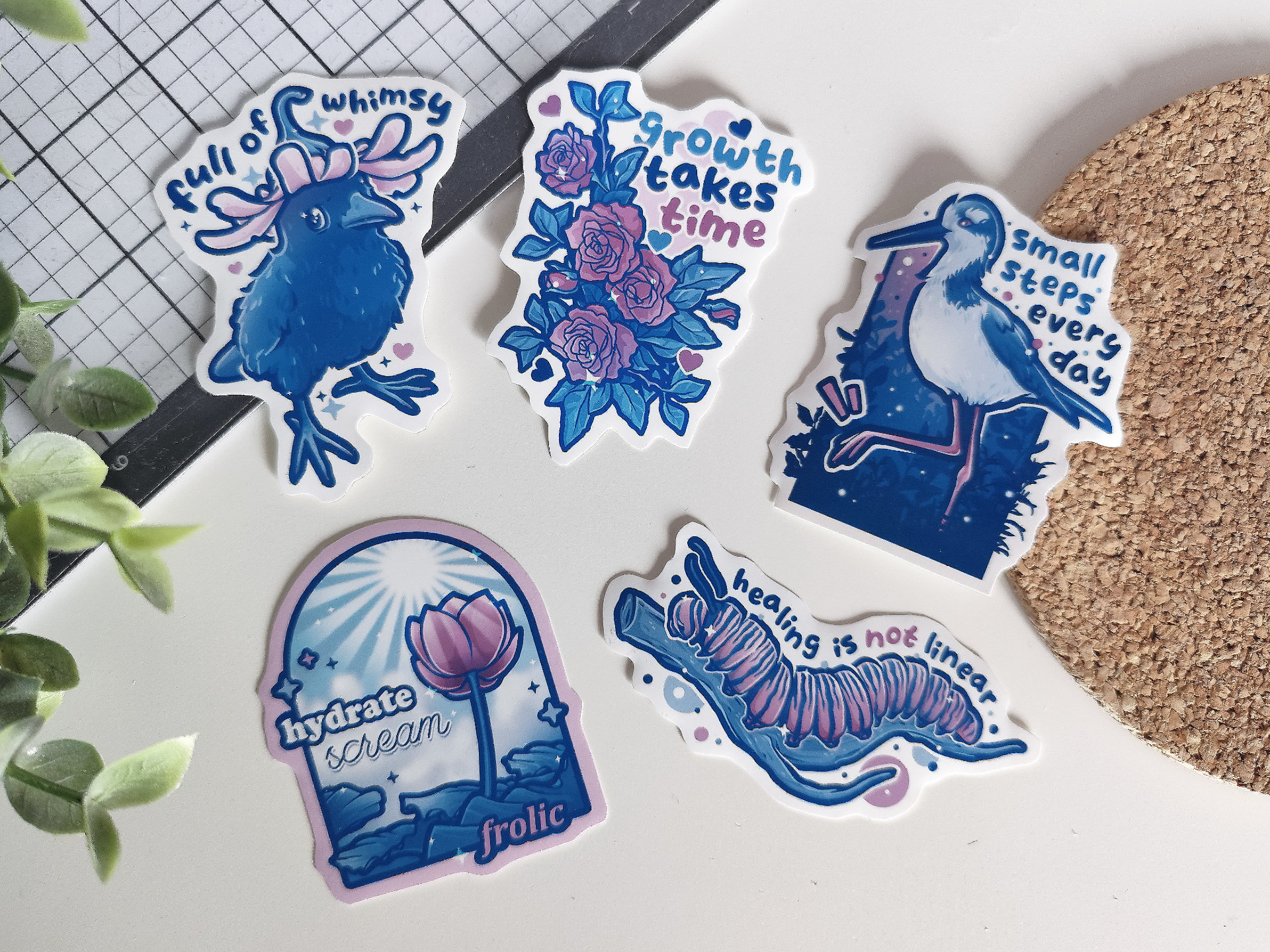 ✸ Velikost: "Full of Whimsy" - 6 x 8 cm, "Growth Takes Time" - 5.50 x 7.50 cm; "Small Steps Every Day" - 5.50 x 7 cm; "Hydrate, Scream, Frolic" - 5.50 x 6.50 cm; "Healing Is Not Linear" - 8.50 x 4 cm