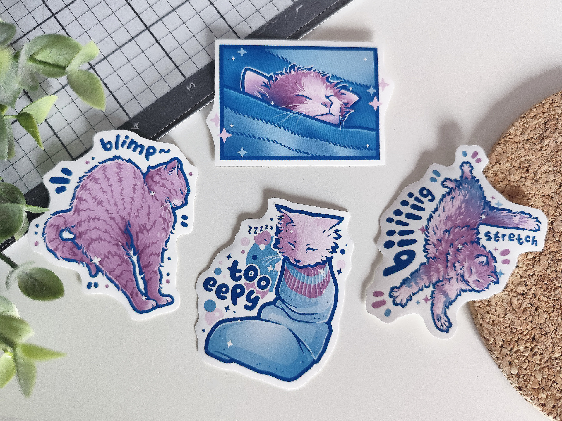 ✸ Size: "Biiiig Stretch" - 5.50 x 7 cm; Kitten In Sheets - 6.50 x 4.80 cm; "Blimp" - 7 x 6.50 cm; "Too Eepy" - 5.50 x 6.50 cm